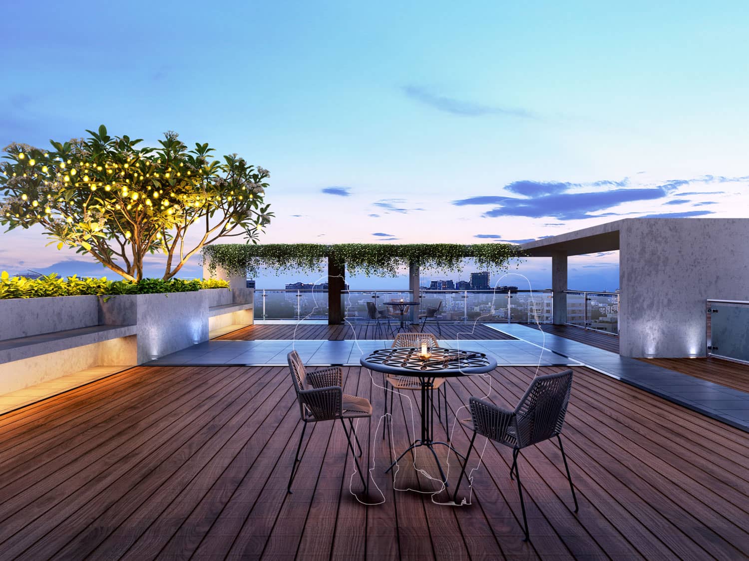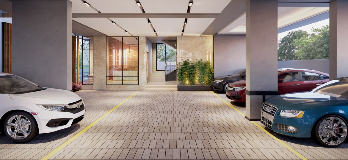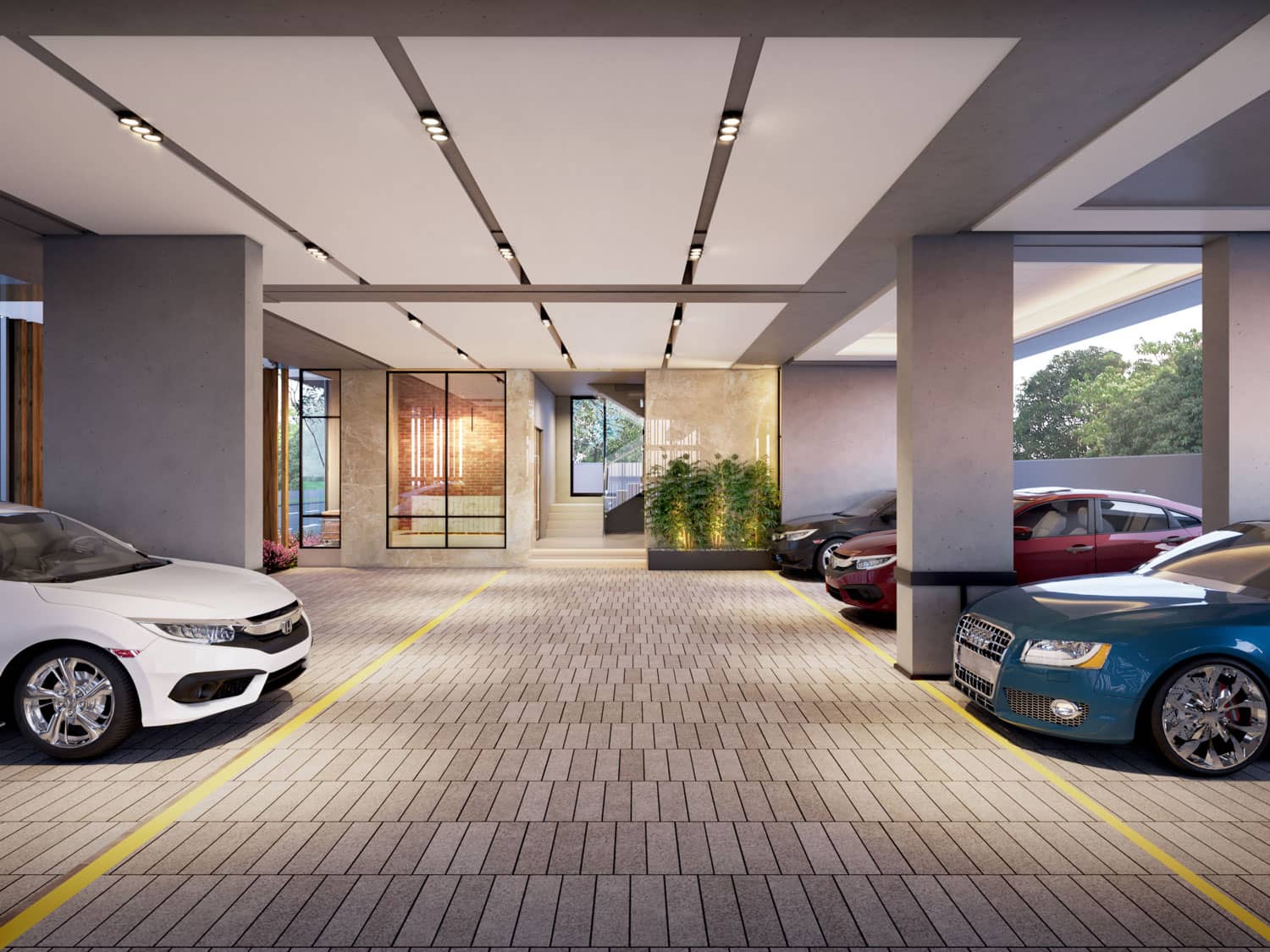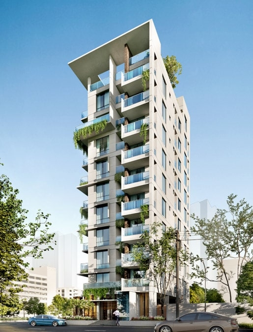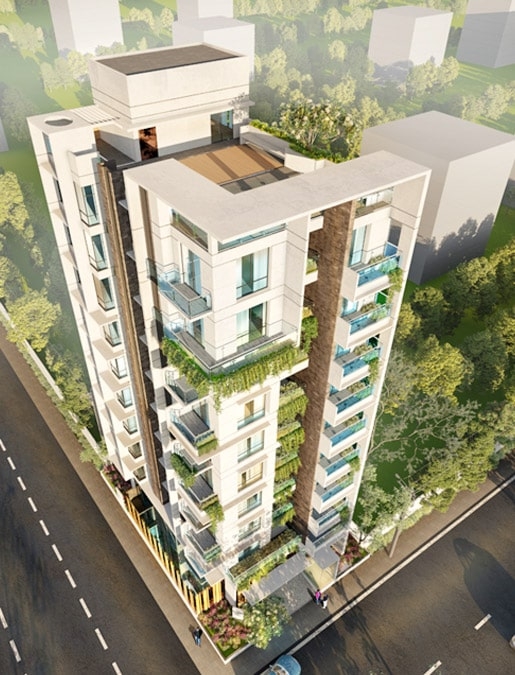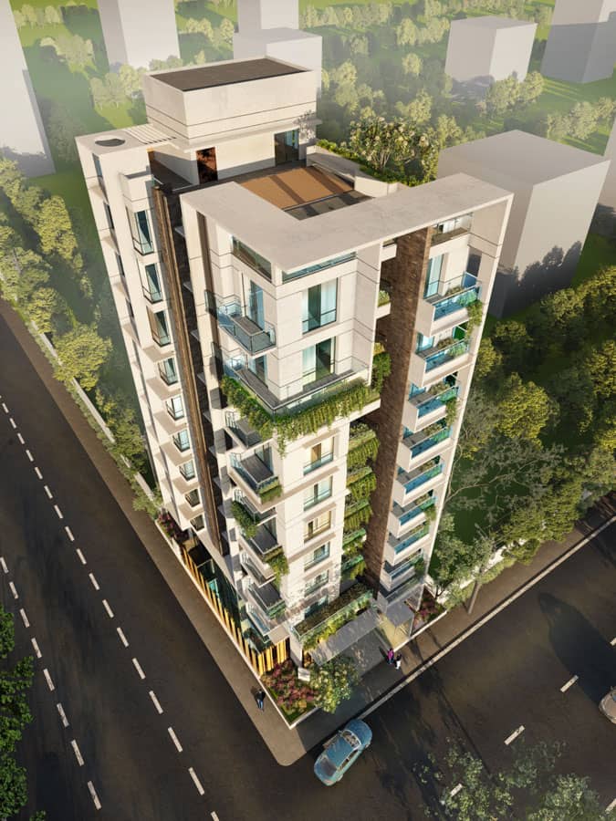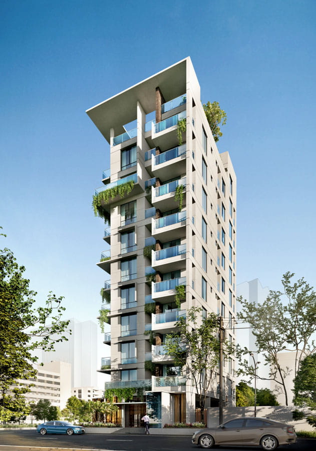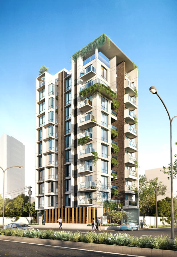 The building consists of a single apartment per floor. Balconies are perched on the front side and are designed in a manner which allows both natural light to flood into the rooms, and also act as a screening layer for privacy.